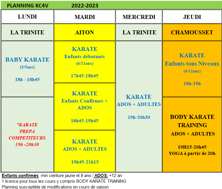 Les inscriptions et premiers cours débuteront le 23 aout pour la section compétition et à compter du lundi 12 septembre pour toutes les autres sections (BODY, KARATE) ! Voir le planning ci dessous